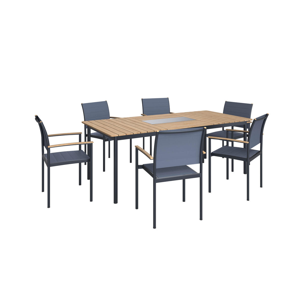 Ez a kerti étkezőgarnitúra elegáns és időtálló megoldást kínál kültéri étkezésekhez. A szett 1 asztalból és 6 darab székből áll, amely kényelmes helyet biztosít családi és baráti összejövetelekhez a kertben vagy a teraszon.Az asztal és a székek nemesacél vázzal rendelkeznek, amely stabil szerkezetet és hosszú élettartamot biztosít. A váz porszórt, sötétszürke felületkezelése modern megjelenést kölcsönöz, miközben ellenáll a kültéri használat során jelentkező igénybevételnek. Az asztallap szögletes alakú, valódi fa lécekből készült, amelyek természetes megjelenést és kellemes kontrasztot adnak a fém vázzal szemben.A székek fa berakásos karfákkal egészülnek ki, amelyek nemcsak esztétikai értéket képviselnek, hanem növelik a használati komfortot is. Az asztallap és a karfák anyaga valódi, tömör tíkfa, amely kiemelkedő tartósságáról és időjárásálló tulajdonságairól ismert, így ideális választás kültéri bútorokhoz.A fém és a természetes fa harmonikus kombinációja miatt ez a tíkfa kerti étkezőgarnitúra stílusos és funkcionális eleme lehet bármely kültéri térnek.Étkezőasztal méretei: szé/ma/mé: kb. 100 x 210 x 75 cm. Max. terhelhetőség: kb. 150 kg. Székek méretei: szé/ma/mé: kb. 57 x 92 x 57 cm. Max. terhelhetőség: kb. 160 kg.