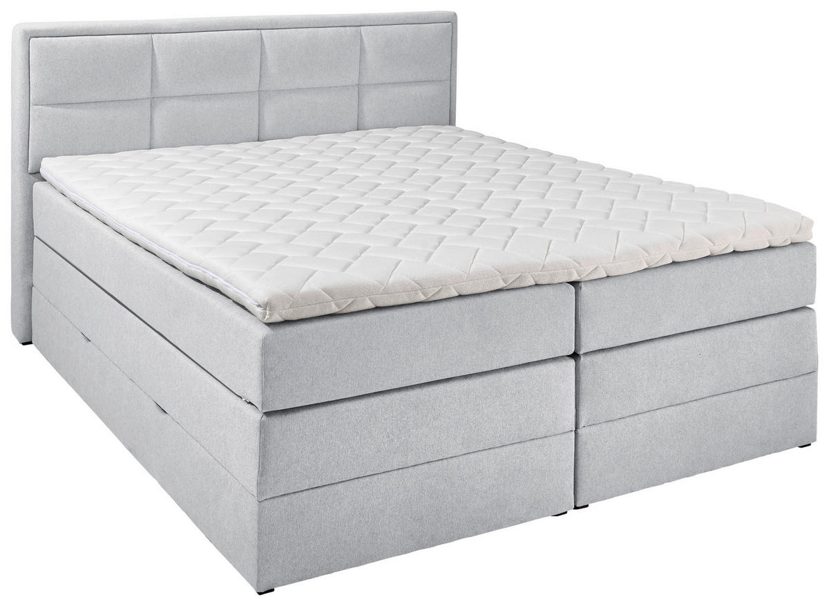 Az ágyneműtartó praktikus tárolóhelyet kínál mindenféle lakáskiegészítő számára. Tegye a hálószobát a feltöltődés terévé ezzel a szürkésbézs CARRYHOME boxspring-ággyal (fekvőfelület: kb. 180 x 200 cm) ágyneműtartóval, matraccal, fedőmatraccal és kárpitozott fejtámlával!