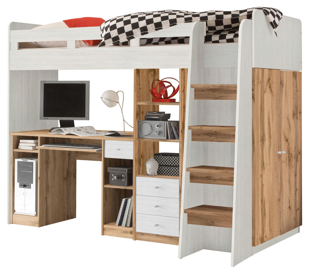 Egyedi megjelenésű CARRYHOME galériaágy íróasztallal. Tökéletes választás azoknak, akik komplett megoldásokat keresnek, és nem akarnak bajlódni a különböző darabok egymáshoz méregetésével. Faalapú anyagból készült, fehér tölgyfaszínű, abszolút összhangot teremtő bútor együttes. Igazán praktikus tervezésével számos tárolási lehetőséget kínál. 4 db fiók, 6 db polcos rekesz, illetve egy oldalsó kis szekrény biztosítanak elegendő helyet. A szekrény belseje kettéosztott : egy akasztós és egy 3 polcos oldalt találunk benne. A galériás ágy magasított széleivel felel a biztonságos pihenésért, míg az íróasztalnál megfelelő méretű hely lett kialakítva a tanuláshoz, vagy más kreatív tevékenységhez. A modern oktatás elengedhetetlen részeként számítógépháztartó, egy hátsó vezeték kivezető nyílás, illetve kihúzható billentyűzet is helyet kapott a garnitúrában. Méretei: hosszúság/szélesség/magasság: 204/95/160 cm, teljes szélesség létrával: 124 cm, fekvőfelület: 90/200 cm.Nem tartozéka, de külön megrendelhető: matrac (max. 10 cm magas ajánlott)