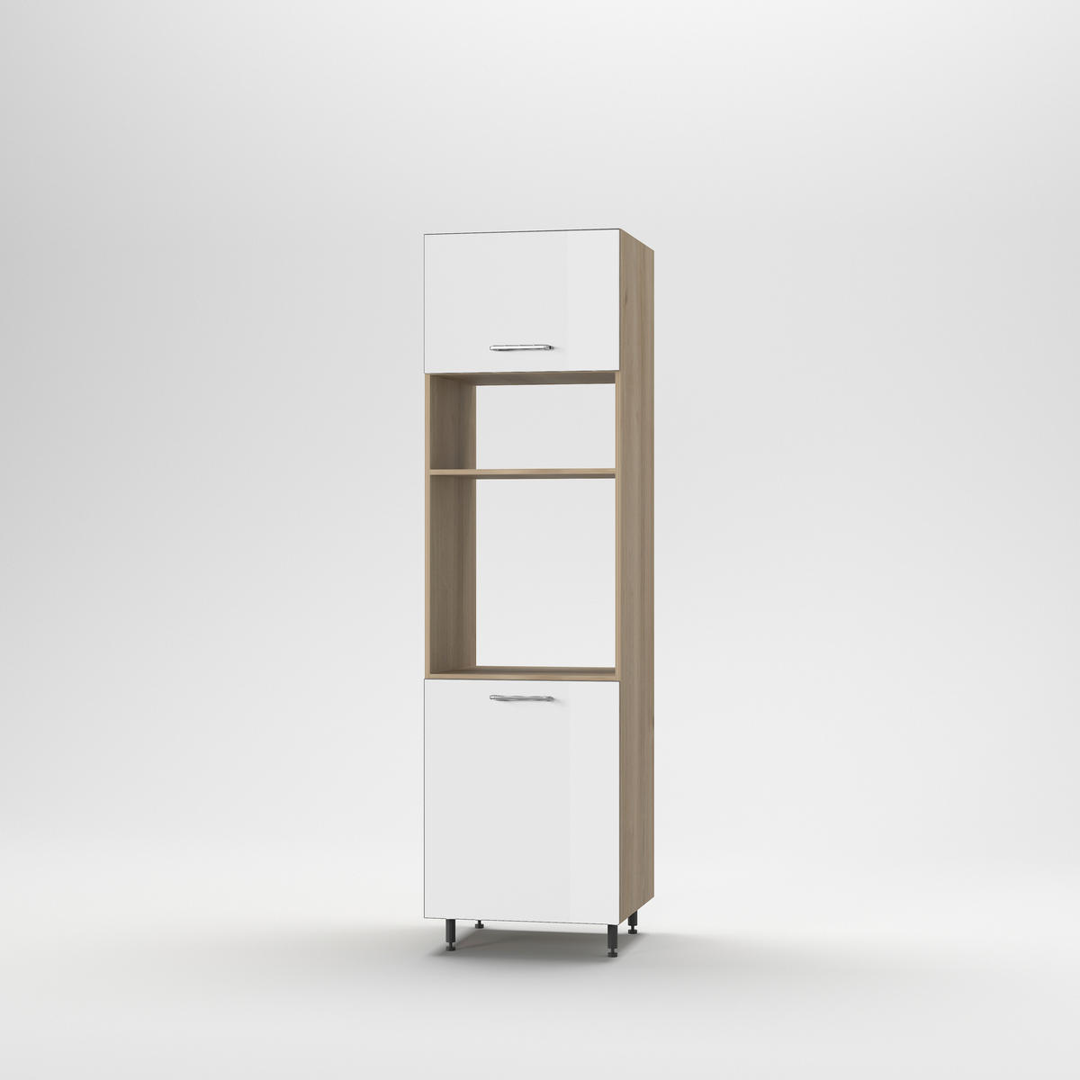 Ez a 2 ajtós sütő-mikrós elem a Carryhome elemes konyhabútor család tagja. Ajtófrontja; magasfényű fehér színű, ABS élvédett, a korpusza; Belfast tölgy dekorral ellátott faforgácslemez..